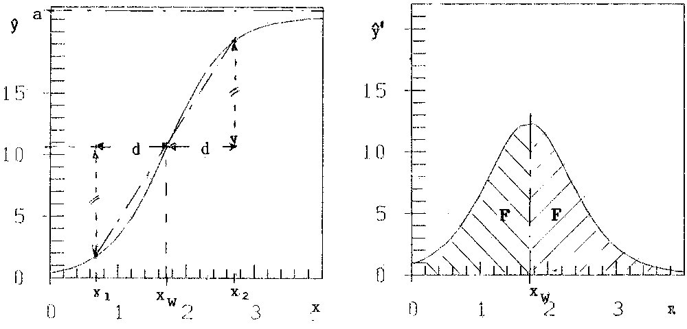 Together with condition (4b) these are a lot of restrictions, imposed on the growth-function ŷ(x). They mean the symmetry of the curve ŷ and inclination ŷ' to point (xw, ŷw ). See figure 1a. Still more evident are these restrictions in figure 1b, the representation of ŷ' =